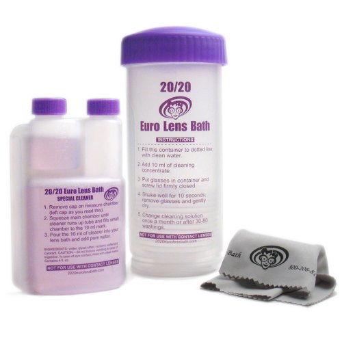 Superior to any spray or ultrasonic cleaner, the 2020 EURO LENS BATH is a one of a kind system that bathes away all dust, grime, sun blocks, body oils, make-up and hair products In 60 seconds-and it won't damage any coatings Simply place your glasses in the special container with cleaner solution, screw the lid on and shake for 10 seconds Remove and wipe clean with the microfiber cloth, for a completely clean pair of glasses with out any steaks or smearing. It will also help preserve nose pads and frames integrity Includes: Washer, 4 OZ Solution and Microfiber cleaning cloth